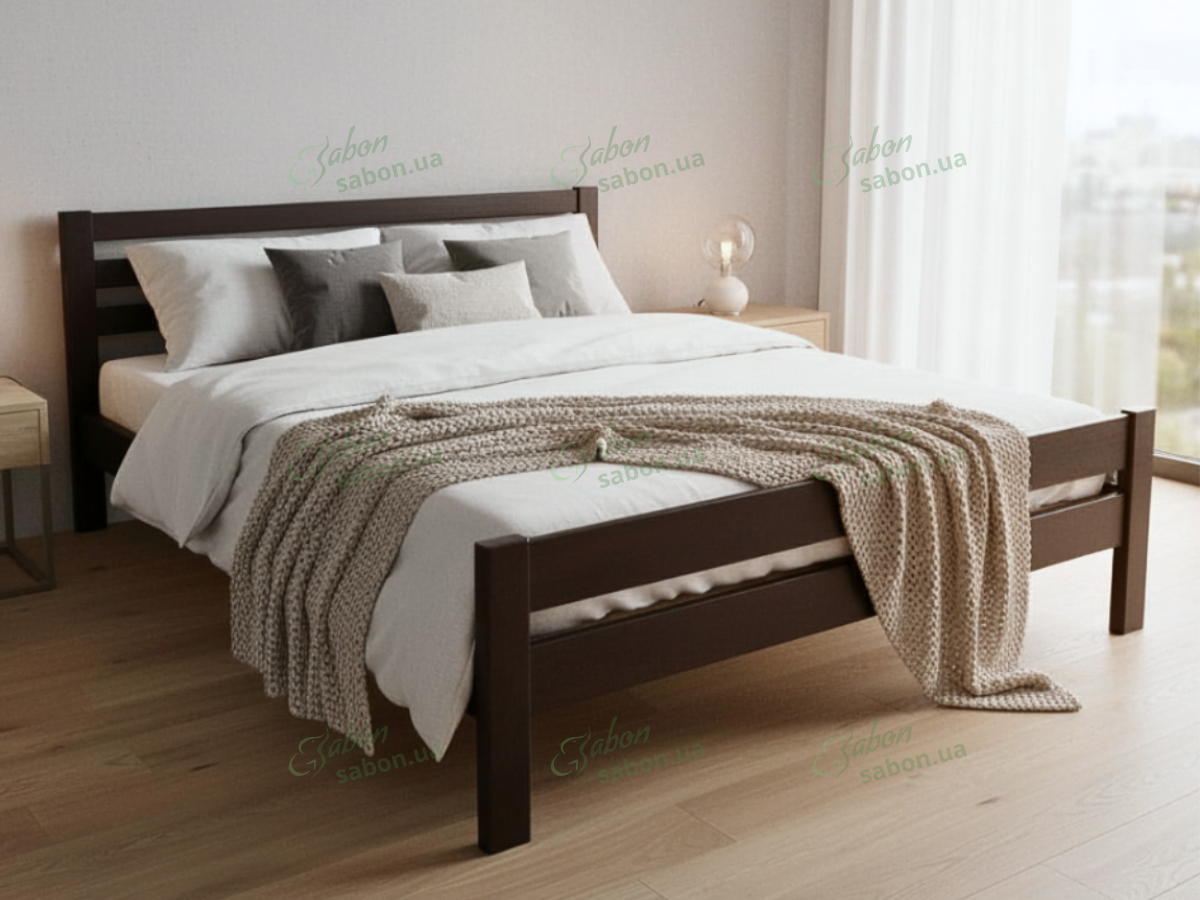 Дерев’яне ліжко Прем’єра Люкс із масиву ясена — це надійна та стильна модель у ціновому класі комфорт, яка поєднує природну красу деревини та продуману конструкцію для щоденного використання. Міцний ясень відзначається довговічністю і виразною текстурою, а покриття італійським лаком у два шари забезпечує захист поверхні та підкреслює натуральний малюнок дерева. Висота узголів’я становить 80 см — зручна для відпочинку та створення затишної атмосфери в спальні. Модель виконана без узніжжя, що додає легкості дизайну та візуально розширює простір. Висота узніжжя — 36 см. Ліжко встановлене на ніжках, а висота від підлоги до ламелей складає 26 см, що полегшує прибирання та забезпечує додаткову вентиляцію матраца.