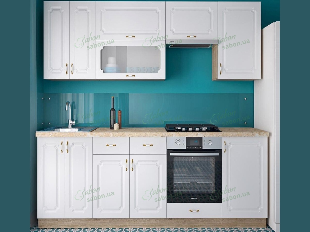Кухня виконана з ламінованої ДСП (ЛДСП) та МДФ, що забезпечує високу стійкість до впливу вологи, перепадів температур та механічних навантажень. Це гарантує тривалий термін експлуатації гарнітура. ЛДСП корпусу має колір дуб Сонома, а фасади можуть бути виконані в різних відтінках без додаткової вартості: білий супермат, алебастр структура, кварцит, вотан, сіра структура.