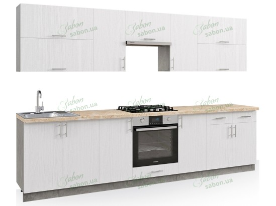 Кухня виконана з ламінованої ДСП (ЛДСП) та МДФ, що забезпечує високу стійкість до впливу вологи, перепадів температур та механічних навантажень. Це гарантує тривалий термін експлуатації гарнітура. ЛДСП корпусу має колір Бетон, а фасади можуть бути виконані в різних відтінках без додаткової вартості: антрацит, бетон, білий стуктурний, дуб Аппалачі, дуб Сонома, дуб Сонома трюфель.