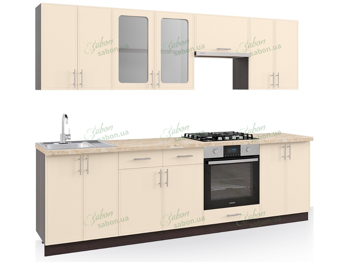 Кухня виконана з ламінованої ДСП (ЛДСП) та МДФ, що забезпечує високу стійкість до впливу вологи, перепадів температур та механічних навантажень. Це гарантує тривалий термін експлуатації гарнітура. ЛДСП корпусу має колір дуб Венге темний, а фасади можуть бути виконані в різних відтінках без додаткової вартості: білий супермат, алебастр структура, кварцит, вотан, ваніль супермат.