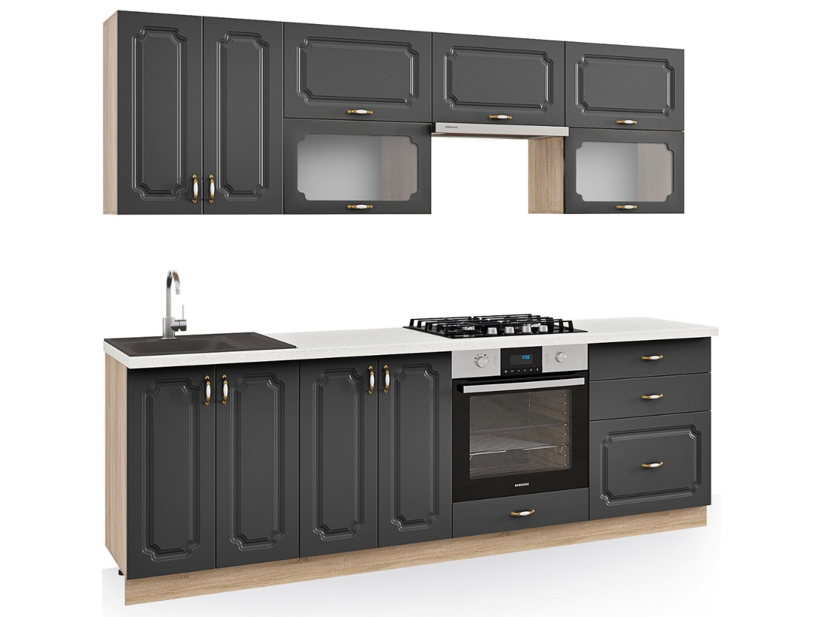 Кухня виконана з ламінованої ДСП (ЛДСП) та МДФ, що забезпечує високу стійкість до впливу вологи, перепадів температур та механічних навантажень. Це гарантує тривалий термін експлуатації гарнітура. ЛДСП корпусу має колір дуб Сонома, а фасади можуть бути виконані в різних відтінках без додаткової вартості: білий супермат, алебастр структура, кварцит, вотан, сіра структура.