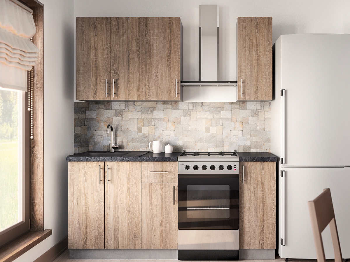 Кухня виконана з ламінованої ДСП (ЛДСП) та МДФ, що забезпечує високу стійкість до впливу вологи, перепадів температур та механічних навантажень. Це гарантує тривалий термін експлуатації гарнітура. ЛДСП корпусу має колір Бетон, а фасади можуть бути виконані в різних відтінках без додаткової вартості: антрацит, бетон, білий стуктурний, дуб Аппалачі, дуб Сонома, дуб Сонома трюфель.