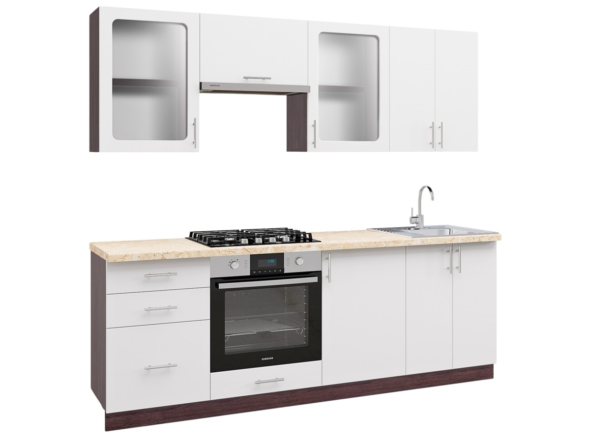 Кухня виконана з ламінованої ДСП (ЛДСП) та МДФ, що забезпечує високу стійкість до впливу вологи, перепадів температур та механічних навантажень. Це гарантує тривалий термін експлуатації гарнітура. ЛДСП корпусу має колір дуб Венге темний, а фасади можуть бути виконані в різних відтінках без додаткової вартості: білий супермат, алебастр структура, кварцит, вотан, ваніль супермат.