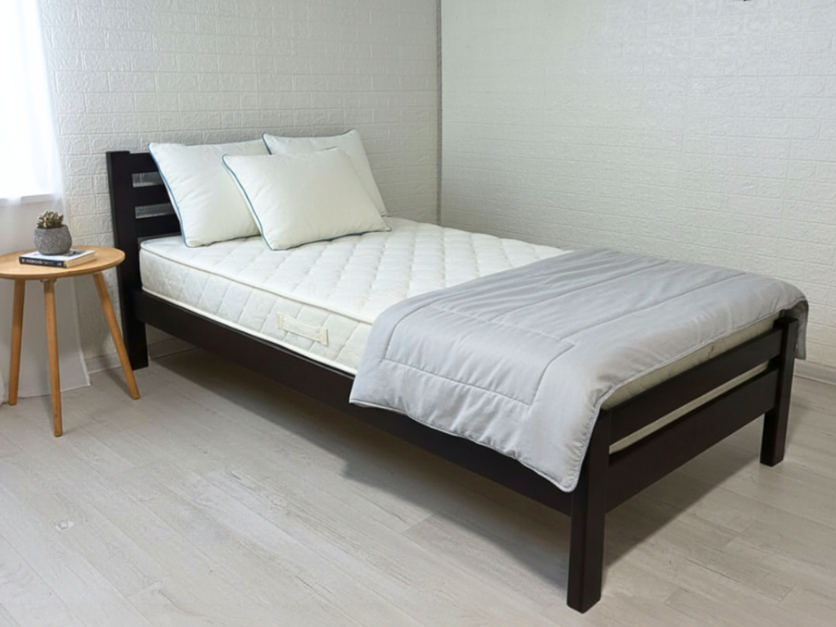 Узголів’я висотою 80 см забезпечує зручну опору, а узніжжя висотою 36 см робить модель візуально легкою та зручною в щоденному користуванні. Основа під матрац складається з ортопедичних гнутоклеєних ламелей із кроком 5,5 см, що сприяють правильному розподілу навантаження та комфортному сну. За потреби можливе встановлення посилених ламелей із кроком 3,5 см, які підвищують витривалість конструкції. Максимальне навантаження на одне спальне місце становить до 150 кг. Поверхня ліжка покрита італійським лаком у два шари, що забезпечує стійкість до зношування та зберігає естетичний вигляд на довгий час. Висота від підлоги до ламелей — 26 см, що дозволяє зручно використовувати простір під ліжком. Габаритні розміри виробу збільшуються на 12 см до ширини та на 9 см до довжини спального місця.