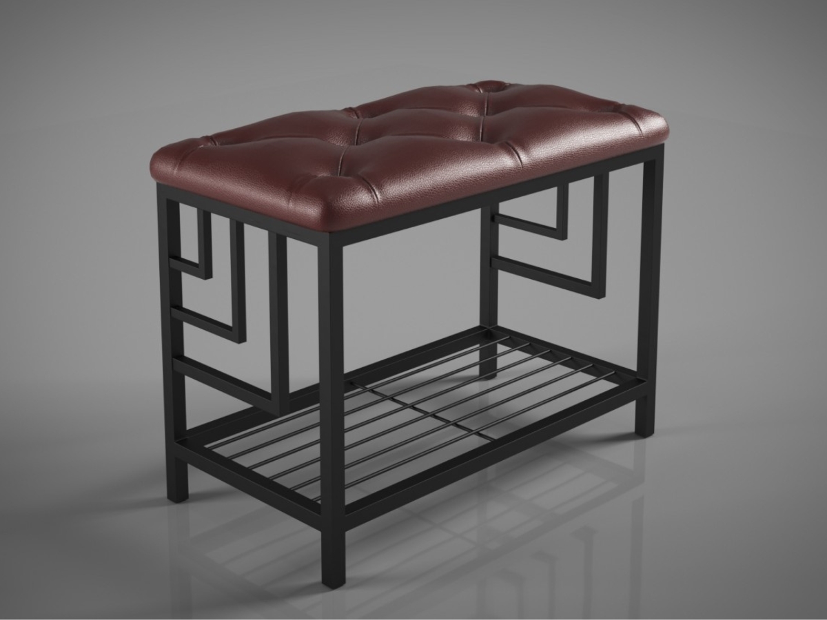 Конструкція та матеріали: Пуф має міцний металевий каркас, який забезпечує стабільність і довговічність виробу. М'яке сидіння оббите якісною екошкірою, що додає комфорту та естетичної привабливості. Нижня частина пуфа оснащена зручною полицею для зберігання взуття або інших речей, що робить його ще більш практичним.