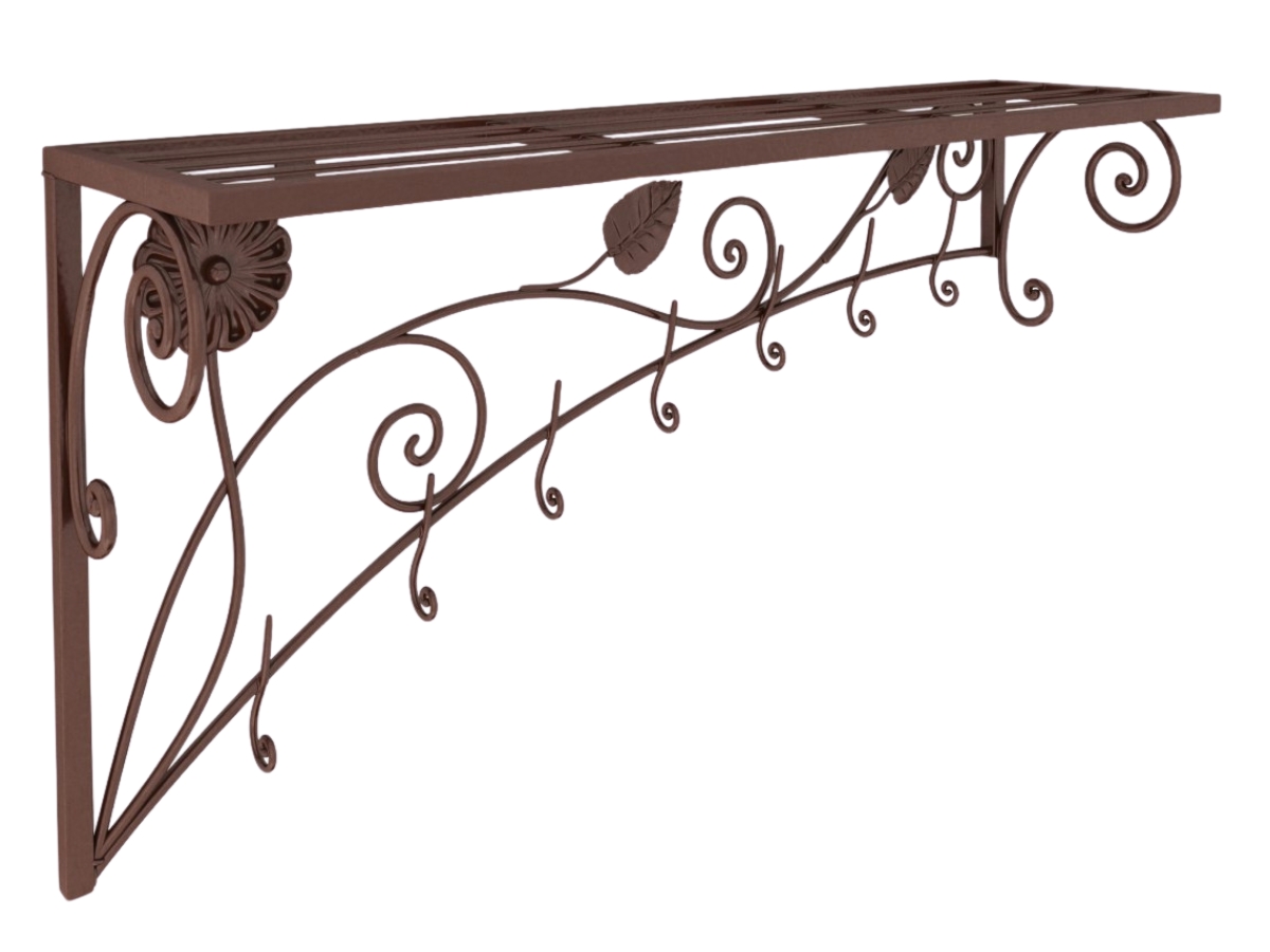 Конструкція передбачає полицю для головних уборів та сім гачків для одягу, які розташовані під кутом, продовжуючи кований візерунок у рослинній тематиці. Це забезпечує зручність використання та естетичний вигляд. Міцний металевий каркас гарантує довговічність виробу, а порошкове фарбування захищає поверхню від пошкоджень і корозії. Виробник пропонує широку палітру кольорів для металевого покриття, що дозволяє підібрати оптимальний варіант під ваш інтер'єр. Серед доступних відтінків — класичні білий, бежевий, коричневий, чорний глянець та чорний оксамит. Для тих, хто прагне додати індивідуальності, доступні варіанти з патинуванням: золото, мідь, срібло. Для створення гармонійного ансамблю в передпокої рекомендується доповнити вішалку іншими елементами серії Річмонд — пуфом та дзеркалом, які виконані в єдиному стилі та ідеально поєднуються між собою.