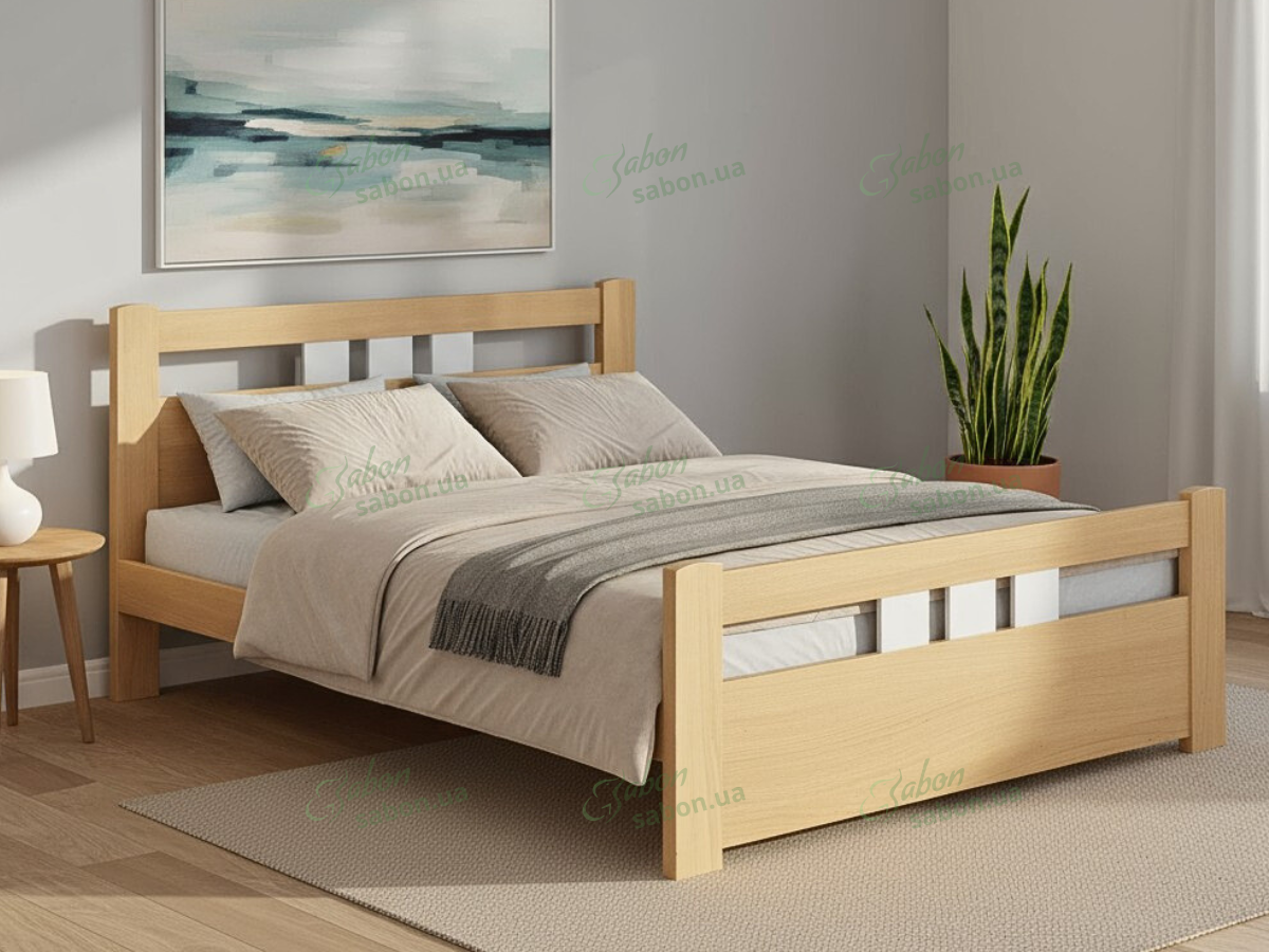 В конструкцию кровати входит изголовье высотой 95 см и каркас с изножьем, что придает модели законченный вид. Кровать делают на ножках, обеспечивая под ней свободное пространство. Основой матраса являются ортопедические гнутоклееные ламели с шагом 4,5 см, которые равномерно поддерживают тело во время сна. Для повышенной прочности доступны усиленные рейки с шагом 3,5 см (доплата + 300 грн за кровать). Максимальная нагрузка – 150 кг на спальное место. Модель предлагается в подростковом, полуторном и двуспальном размерах с длиной спального места 190 или 200 см. Размеры кровати +7 см к ширине и +9 см к длине. Высота от пола до планок 25 см.