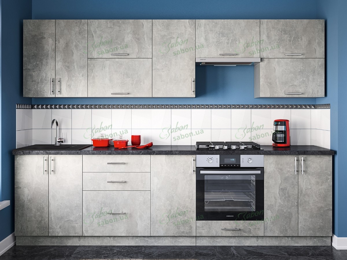 Кухня выполнена из ламинированной ДСП (ЛДСП) и МДФ, что обеспечивает высокую устойчивость к воздействию влаги, перепадам температур и механическим нагрузкам. Это гарантирует длительный срок эксплуатации гарнитуры. ЛДСП корпуса имеет цвет Бетон, а фасады могут быть выполнены в разных оттенках без прибавочной стоимости: антрацит, бетон, белый стуктурный, дуб Аппалачи, дуб Сонома, дуб Сонома трюфель.