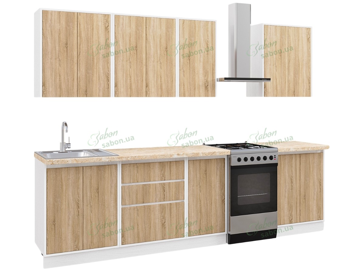 Кухня выполнена из ламинированной ДСП (ЛДСП) и МДФ, что обеспечивает высокую устойчивость к воздействию влаги, перепадам температур и механическим нагрузкам. Это гарантирует длительный срок эксплуатации гарнитуры. ЛДСП корпуса имеет цвет белый структурный, а фасады могут быть выполнены в разных оттенках без прибавочной стоимости: антрацит, бетон, белый структурный, дуб Аппалачи, дуб сонома, дуб сонома трюфель.