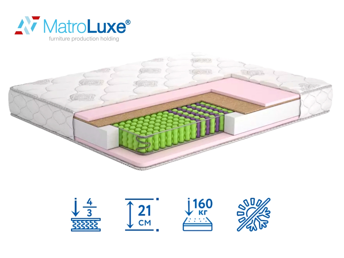 Ортопедический матрас Monika/Моника Home Matroluxe – это двусторонний пружинный матрас с асимметричным уровнем жесткости высотой 21 сантиметров, который способен выдержатьнагрузку до 140 килограмм на одно спальное место. Блок пружин Multi Pocket 3 Zone – это основа матраса Monika/Моника от Матролюкс. Каждая из пружин имеет отдельный чехол и не зависит от остальных, что обеспечивает точечное распределение нагрузки и идеальное повторение контуров тела. Содержание войлока обеспечивает защиту мягких слоев матраса от негативного воздействия пружин. Он дополняет матрас жесткостью и увеличивает его срок эксплуатации.