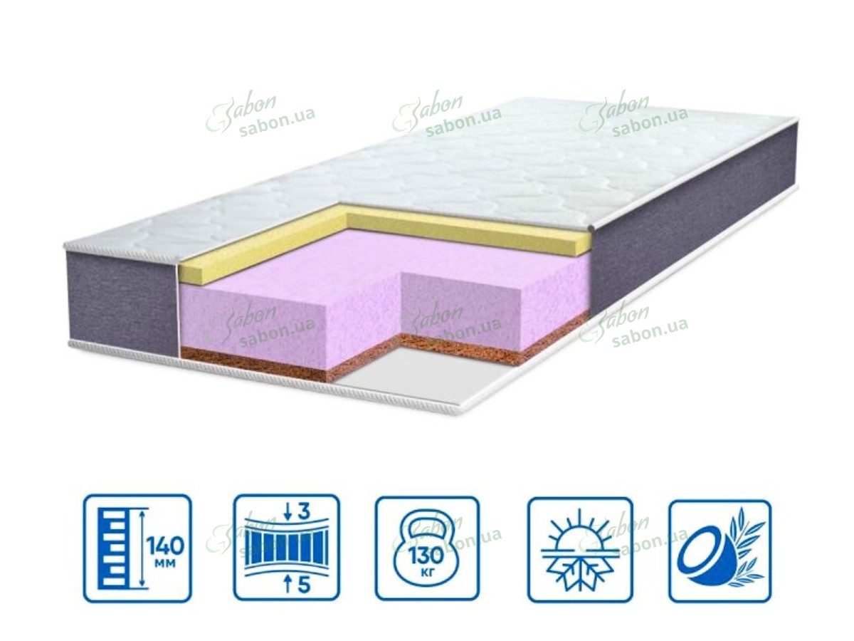 Основой конструкции является монолитный слой высококачественной европейской пены FLEXI, обеспечивающий долговечность, упругость и равномерное распределение нагрузки. Внутренние слои дополнены спанбондом и синтефлексом, что усиливает износостойкость и комфорт эксплуатации. Чехол изготовлен из приятной на ощупь трикотажной ткани, стеганой глубокой прошивкой на объемном наполнителе, а борт выполнен из сверхпрочной ткани «GRAY», сохраняющей форму матраса в течение всего срока службы. Модель оснащена эффектом зима-лето и климат-контролем, благодаря чему поддерживается оптимальный микроклимат в любое время года.