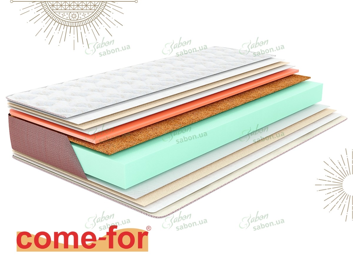 Ортопедический беспружинный матрас Coco Roll от компании Come-For — это ортопедический матрас с разносторонним уровнем жесткости. Одна спальная поверхность имеет высокий уровень жесткости и содержит настил из кокосовой койры, которая обладает высокой прочностью и долговечностью, устойчива к максимальным нагрузкам; в то время как вторая — упругая и мягкая за счет применения слоя из современной упругой пены Aero Foam.