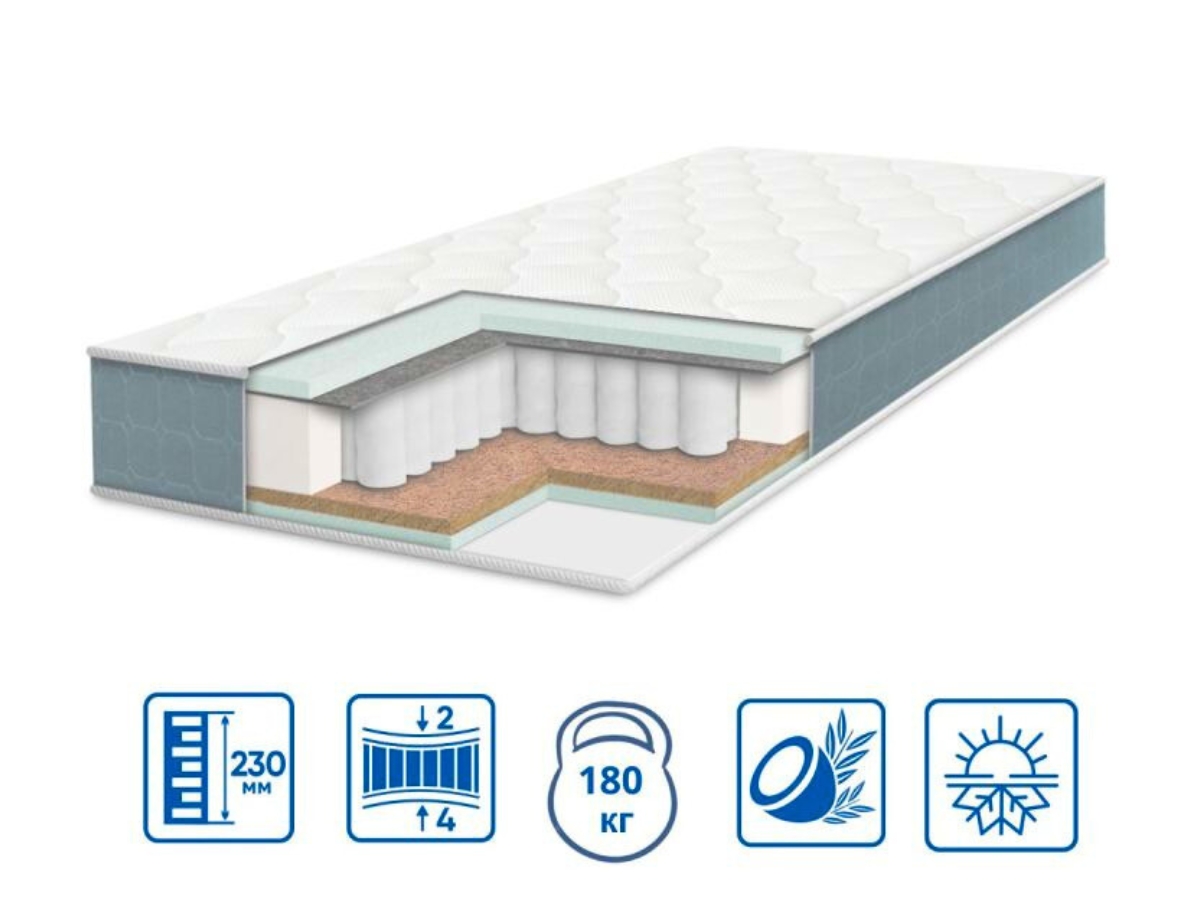 Слой эластичной пены идеально адаптируется под форму тела, обеспечивая мягкость и комфорт. А для любителей большей жесткости использована кокосовая койра с латексом - натуральный материал, который укрепляет ортопедический эффект и позволяет матрасу лучше вентилироваться. Дополнительный слой термовойлока помогает равномерно распределить нагрузку и защищает внутренние слои от деформации. ELIT COCOS выдерживает повышенную нагрузку до 180 кг, что делает его надежным выбором даже для людей с повышенными требованиями к износостойкости матраса. Высота изделия составляет 23 см - оптимальная для комфортного отдыха.