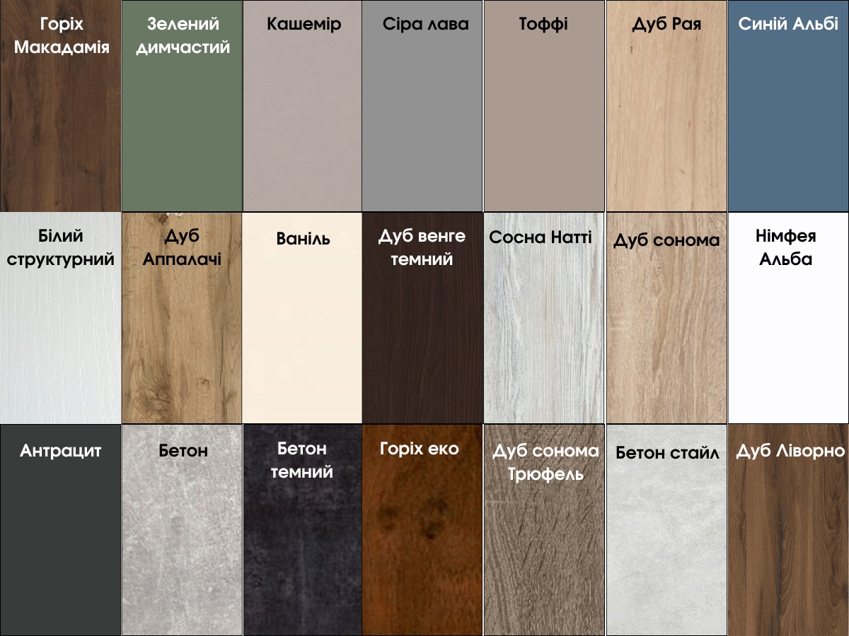 Кольори фасаду ДСП, до вартості +4% до вартості виробу: Дуб аппалачі, Бетон, Антрацит, Німфея альба, Сосна Натті, Бетон темний, Бетон стайл, Зелений димчастий, Синій альбі, Дуб рая